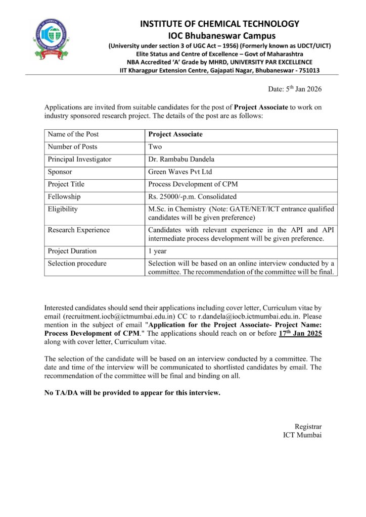 M.Sc. Project positions: Candidates pursuing their 2nd year master degree in any college/university can apply for project.